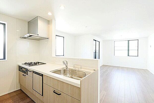 対面式キッチン採用のLDKは広々18畳。開放感のある角地の新築住宅です。