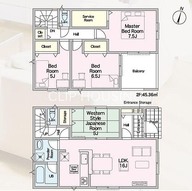 間取り内訳:リビングダイニングキッチン 16帖(1階)・和室 5畳(1階)・洋室 7.5帖(2階)・洋室 6.5帖(2階)・洋室 5帖(2階)
