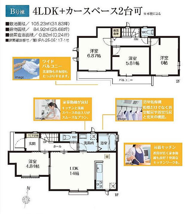| 間取り | 4LDK 間取り内訳:リビングダイニングキッチン 14帖(1階)・洋室 4.8帖(1階)・洋室 5.8帖(2階)・洋室 6帖(2階)・洋室 6.8帖(2階) |