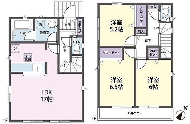 | 間取り | 3LDK 間取り内訳:リビングダイニングキッチン 17帖(1階)・洋室 6.5帖(2階)・洋室 6帖(2階)・洋室 5.2帖(2階) |