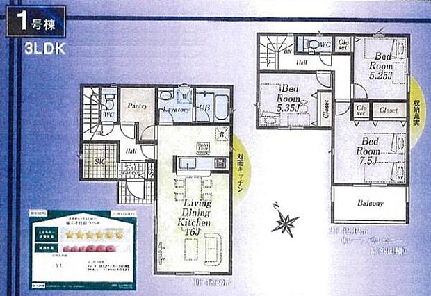| 間取り | 3LDK 間取り内訳:リビングダイニングキッチン 16帖(1階)・洋室 7.5帖(2階)・洋室 5.3帖(2階)・洋室 5.2帖(2階) |