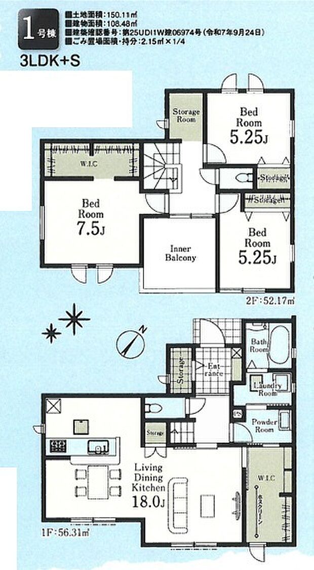 | 間取り | 3SLDK 間取り内訳:リビングダイニングキッチン 18帖(1階)・洋室 5.2帖(2階)x2・洋室 7.5帖(2階)・収納 |