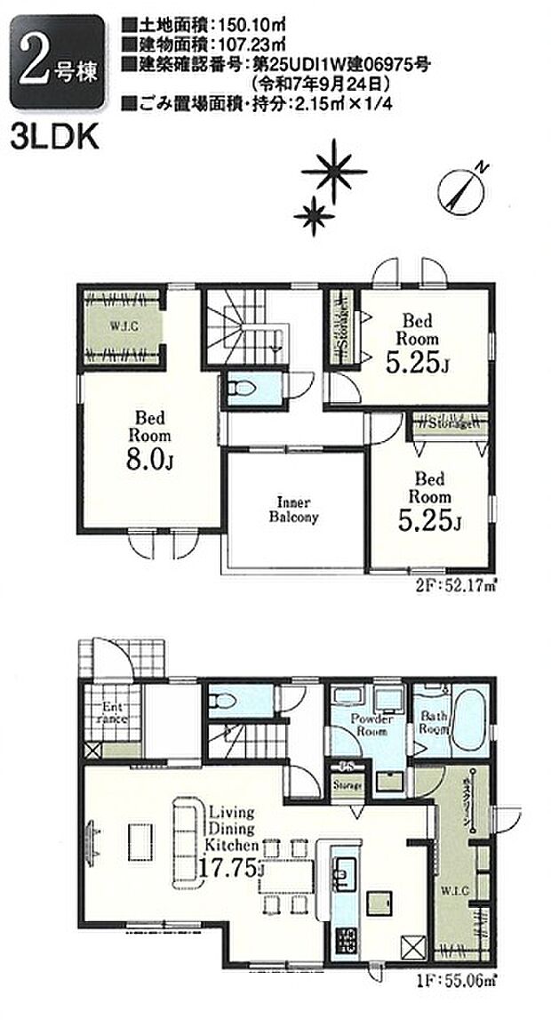 | 間取り | 3LDK 間取り内訳:リビングダイニングキッチン 17.7帖(1階)・洋室 5.2帖(2階)x2・洋室 8帖(2階) |