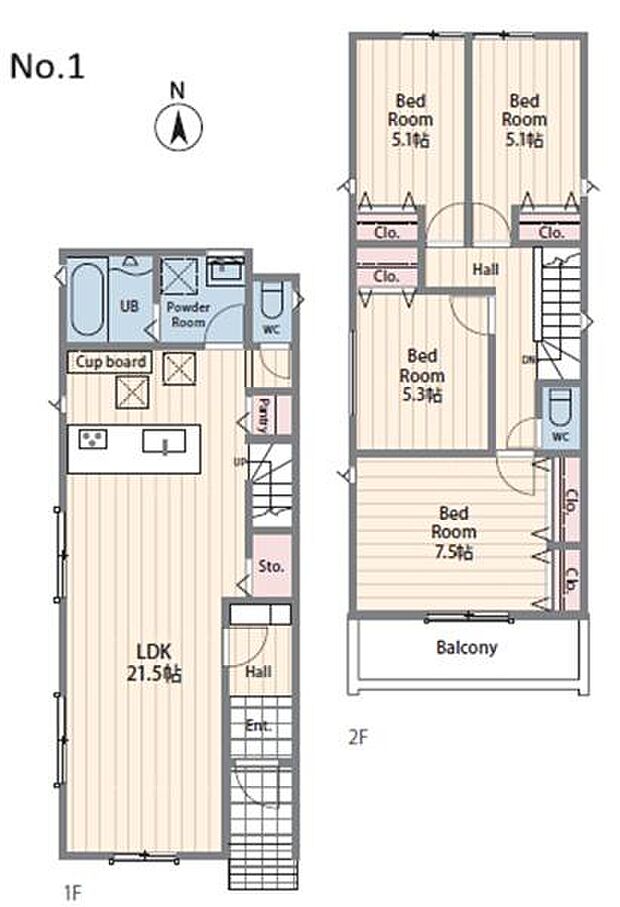 | 間取り | 4LDK 間取り内訳:洋室 5.1帖(2階)・洋室 5.1帖(2階)・洋室 7.5帖(2階)・洋室 5.3帖(2階)・リビングダイニングキッチン 21.5帖(1階) |