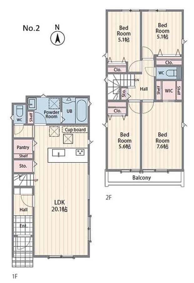| 間取り | 4LDK 間取り内訳:リビングダイニングキッチン 20.1帖(1階)・洋室 7.6帖(2階)・洋室 5.6帖(2階)・洋室 5.1帖(2階)・洋室 5.1帖(2階) |
