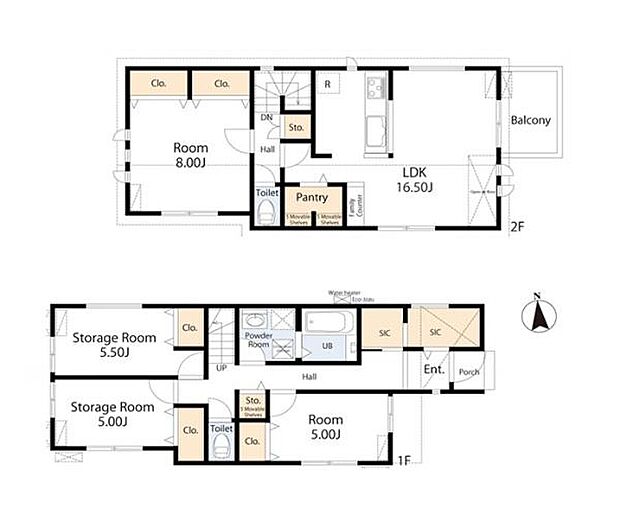 間取り内訳:収納 5.5帖(1階)・収納 5帖(1階)・洋室 5帖(1階)・洋室 8帖(2階)・リビングダイニングキッチン 16.5帖(2階)