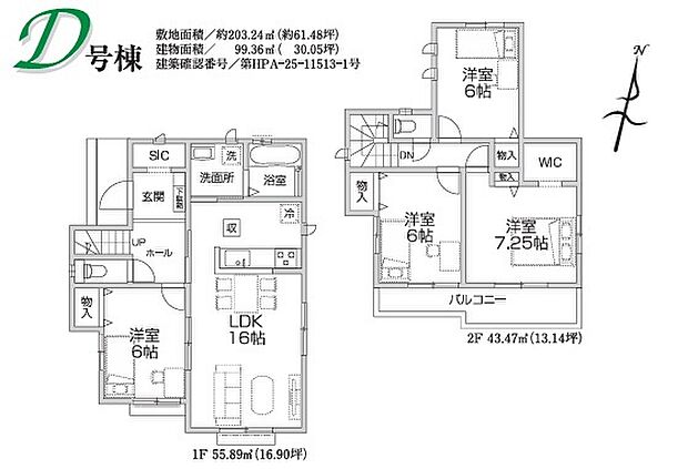 | 間取り | 4LDK 間取り内訳:リビングダイニングキッチン 16帖(1階)・洋室 6帖(1階)・洋室 6帖(2階)x2・洋室 7.2帖(2階) |