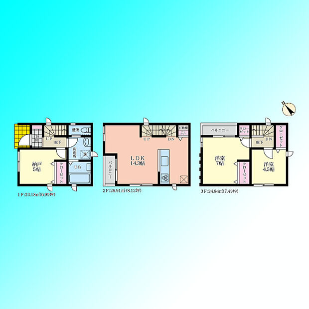 | 間取り | 2SLDK 間取り内訳:収納 5帖・リビングダイニングキッチン 14.3帖・洋室 4.5帖・洋室 7帖 |