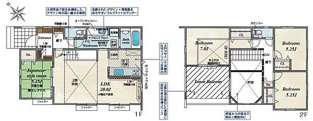 | 間取り | 4LDK 間取り内訳:リビングダイニングキッチン 20帖(1階)・和室 5.2畳(1階)・洋室 7帖(2階)・洋室 5.2帖(2階)・洋室 5.2帖(2階) |