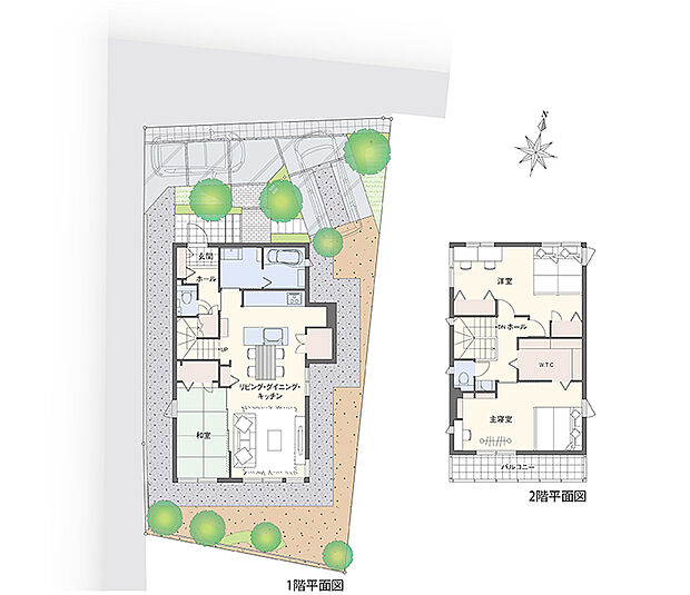| 建物面積 | 【1号】105.11m2(約31.79坪)・【2号】104.36m2(約31.56坪) | ||