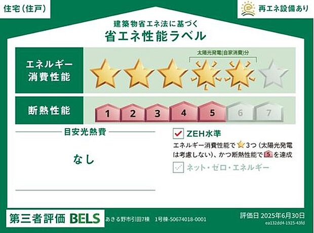 星マークの数が多いほどエネルギー消費性能が高いことを示しています。再エネ設備のない住宅は★0~★4の5段階評価、再エネ設備がある住宅は★0~★6の7段階評価となります。