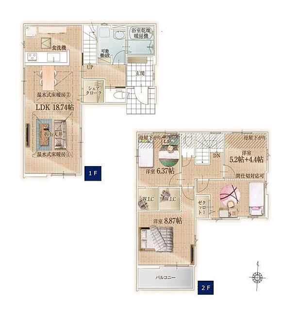 ウォークインクローゼットのある4LDK。リビングには床暖房付き カースペース2台可 (車種による)