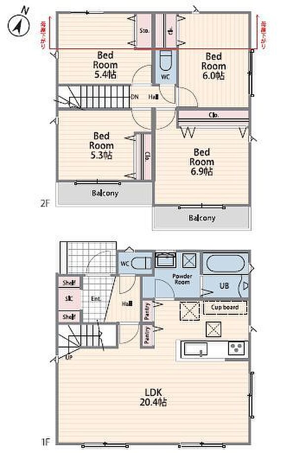 | 間取り | 4LDK 間取り内訳:リビングダイニングキッチン 20.4帖(1階) |