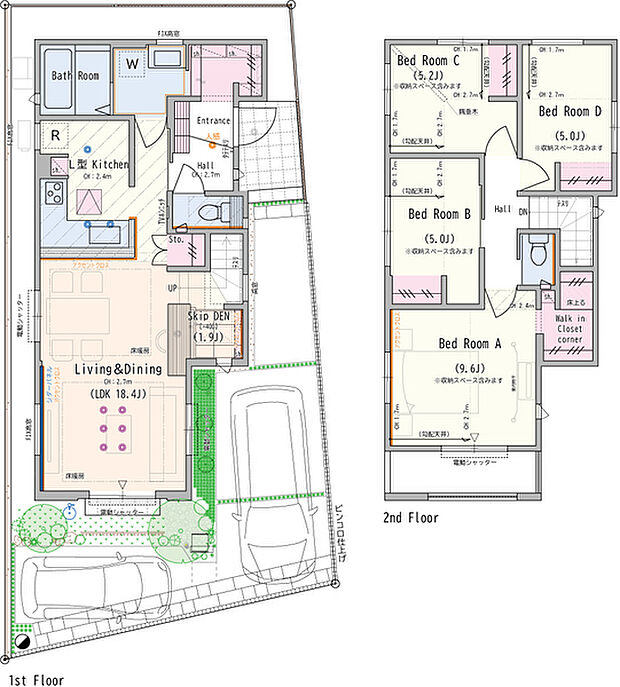 間取り 4LDK+土間クローク+2ウォークインクロゼットコーナー ~ 4LDK+SKIP DEN+ウォークスルー土間クローク+ウォークインクロゼットコーナー 建物階 木造2階建(2×4工法)