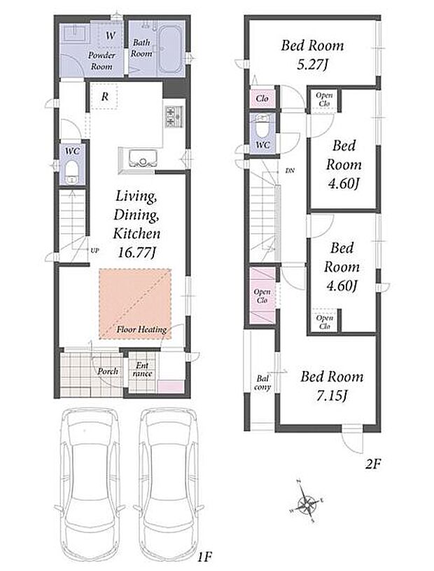 南側5.3m公道に面した陽当り良好な立地。並列2台駐車可能な新築住宅です。