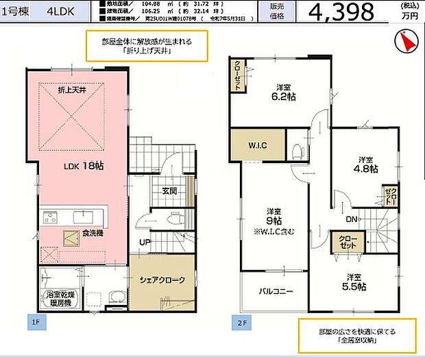 | 間取り | 4LDK(1階にファミリークロークあり) 間取り内訳:洋室 6.2帖(2階)・洋室 4.8帖(2階)・リビングダイニングキッチン 18帖(1階)・洋室 5.5帖(2階)・洋室 9帖(2階) |