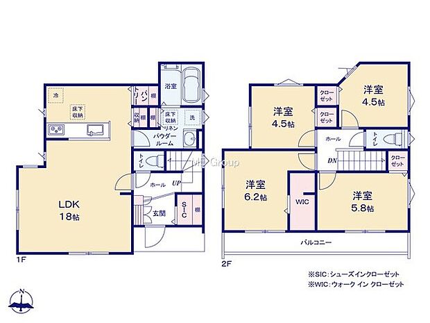 | 間取り | 4LDK 間取り内訳:洋室 6.2帖・リビングダイニングキッチン 18帖・洋室 4.5帖・洋室 5.8帖 |