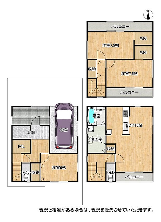 | 間取り | 3LDK 間取り内訳:洋室 6帖(1階)・リビングダイニングキッチン 16帖(1階)・洋室 7.5帖(3階)x2 |