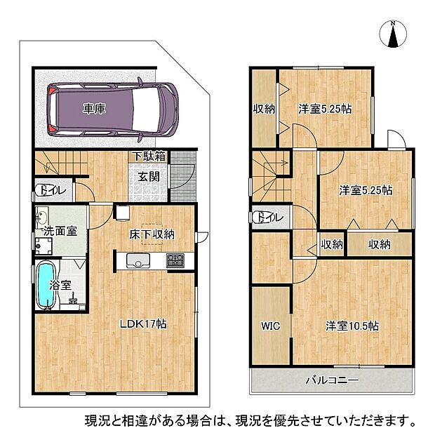 | 間取り | 4LDK 間取り内訳:リビングダイニングキッチン 17帖(1階)・洋室 10.5帖(2階)・洋室 5.2帖(2階)x2 |