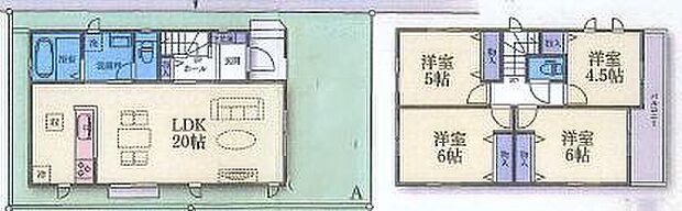 | 間取り | 4LDK 間取り内訳:洋室 5帖(2階)・洋室 4.5帖(2階)・リビングダイニングキッチン 20帖(1階)・洋室 6帖(2階)x2 |