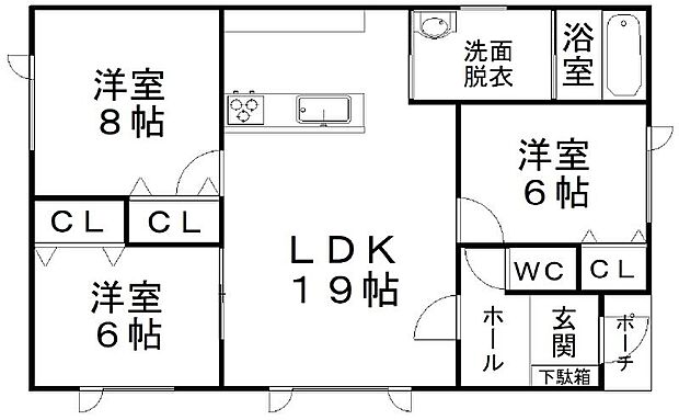 | 間取り | 3LDK 間取り内訳:リビングダイニングキッチン 19帖(1階)・洋室 8帖(1階)・洋室 6帖(1階)・洋室 6帖(1階) |