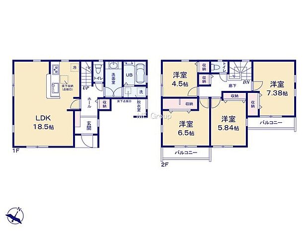 間取り内訳:リビングダイニングキッチン 18.1帖・洋室 7.3帖・洋室 6.5帖・洋室 5.8帖・洋室 4.5帖