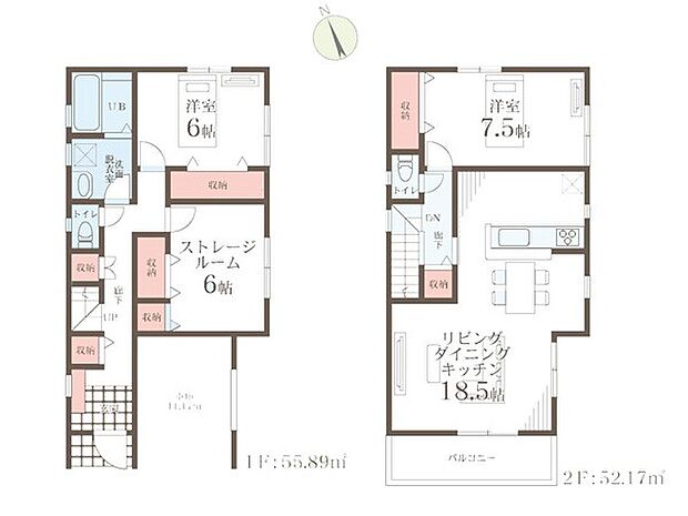 | 間取り | 2SLDK 間取り内訳:収納 6帖・洋室 6帖・リビングダイニングキッチン 18.5帖・洋室 7.5帖 |