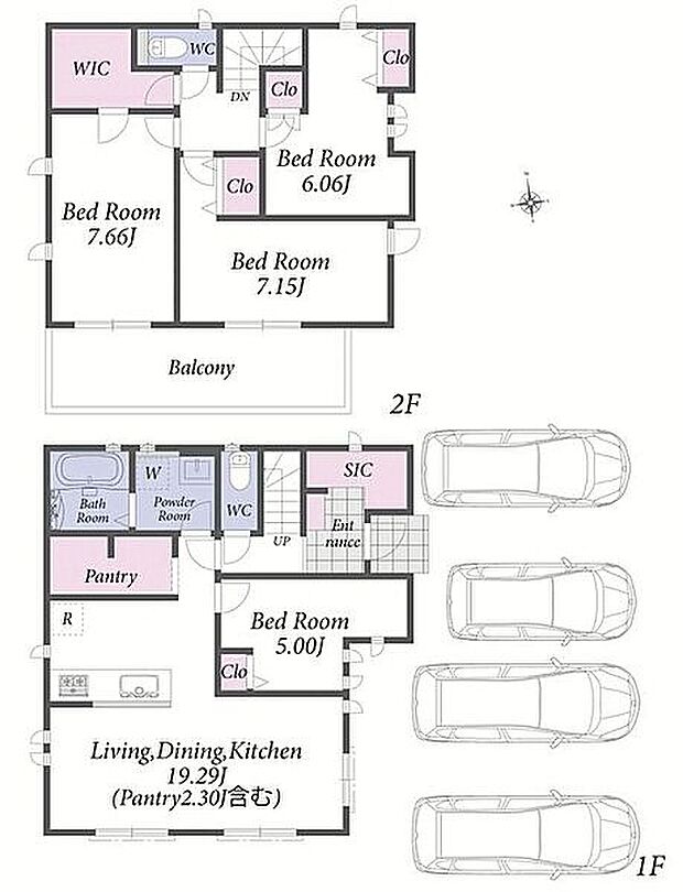 パントリー・ウォークインクローゼット有。並列駐車4台可能な新邸です。