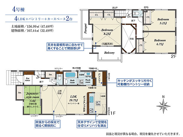 | 建物面積 | 107.44m2(約32.50坪)~114.27m2(約34.56坪) | ||