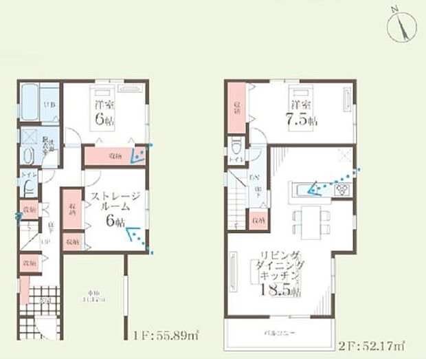 | 間取り | 2SLDK 間取り内訳:洋室 6帖(1階)・収納 6帖(1階)・リビングダイニングキッチン 18.5帖(2階)・洋室 7.5帖(2階) |