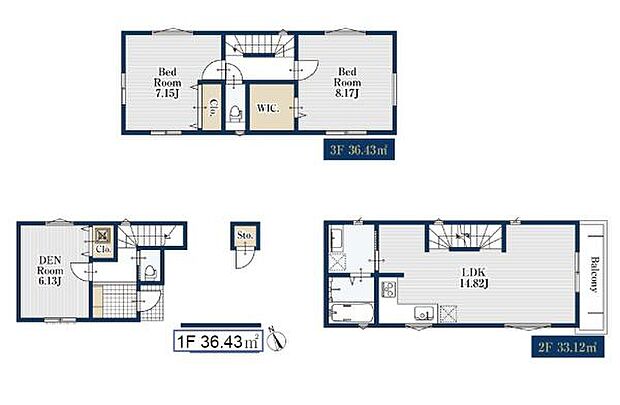 | 間取り | 2SLDK 間取り内訳:収納 6.1帖(1階)・リビングダイニングキッチン 14.8帖(2階)・洋室 8.1帖(3階)・洋室 7.1帖(3階) |