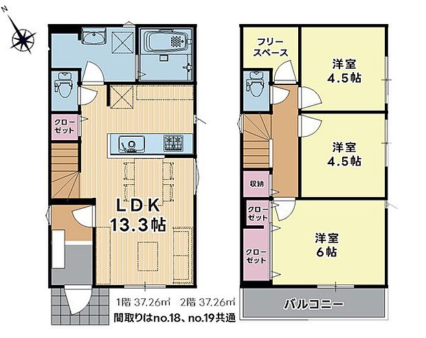 | 間取り | 4LDK 間取り内訳:リビングダイニングキッチン 13.3帖・洋室 6帖・洋室 4.5帖・収納 3帖 |