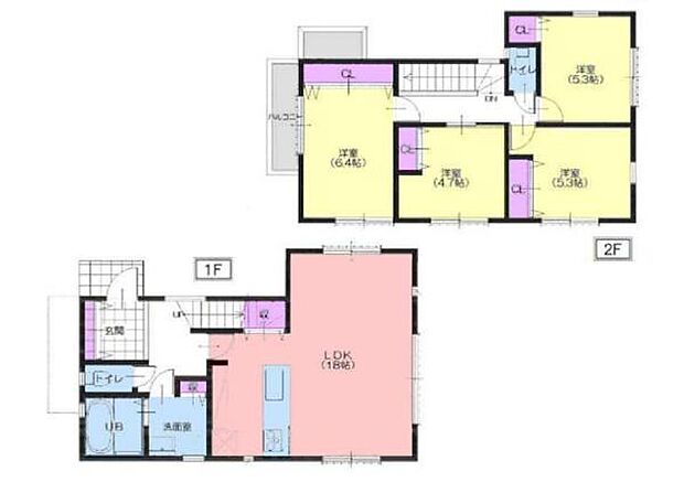 | 間取り | 4LDK 間取り内訳:リビングダイニングキッチン 18帖(1階)・洋室 6.4帖(2階)・洋室 5.3帖(2階)・洋室 5.3帖(2階)・洋室 4.7帖(2階) |