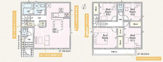 | 間取り | 4LDK 間取り内訳:リビングダイニングキッチン 18.5帖(1階)・洋室 7帖(2階)・洋室 5.7帖(2階)・洋室 4.5帖(2階)・洋室 4.5帖(2階) |