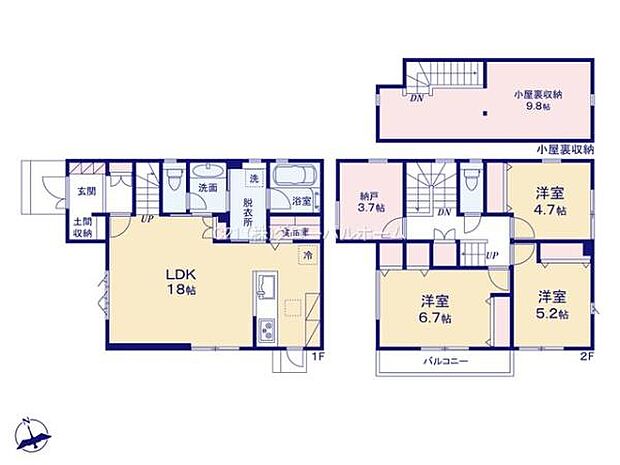 | 間取り | 3LDK 間取り内訳:リビングダイニングキッチン 18帖(1階)・洋室 4.7帖(2階)・洋室 5.2帖(2階)・洋室 6.7帖(2階) |
