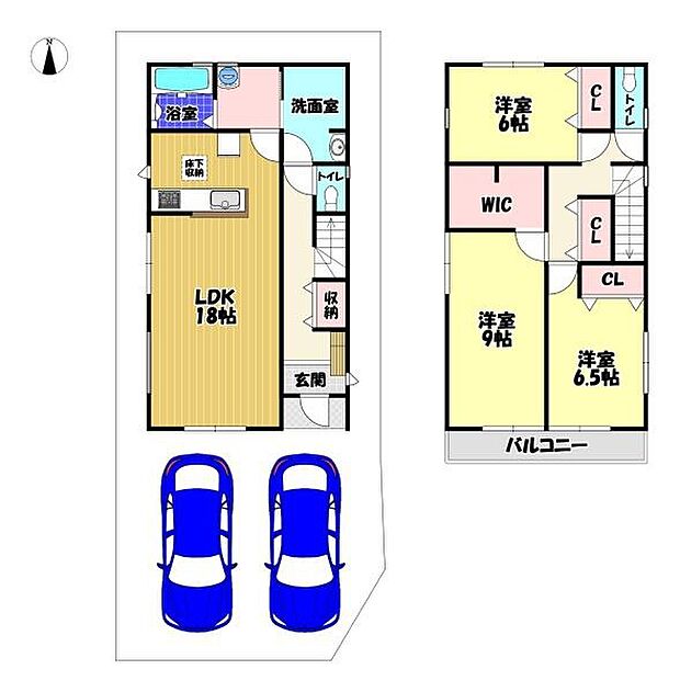 | 間取り | 3LDK 間取り内訳:リビングダイニングキッチン 18帖(1階)・洋室 6.2帖(2階)・洋室 6.5帖(2階)・洋室 9帖(2階) |