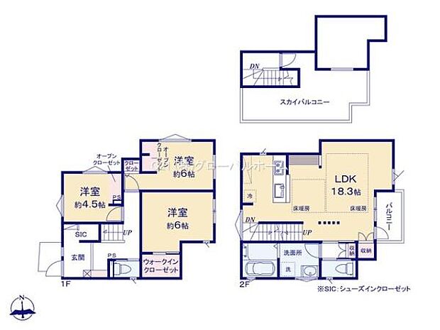 | 間取り | 3LDK 間取り内訳:洋室 4.5帖(1階)・洋室 6帖(1階)・洋室 6帖(1階)・リビングダイニングキッチン 18.3帖(2階) |