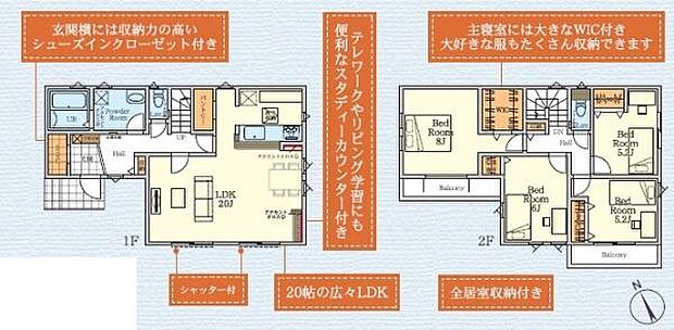 | 間取り | 4LDK 間取り内訳:リビングダイニングキッチン 20帖(1階)・洋室 8帖(2階)・洋室 6帖(2階)・洋室 5.2帖(2階)・洋室 5.2帖(2階) |