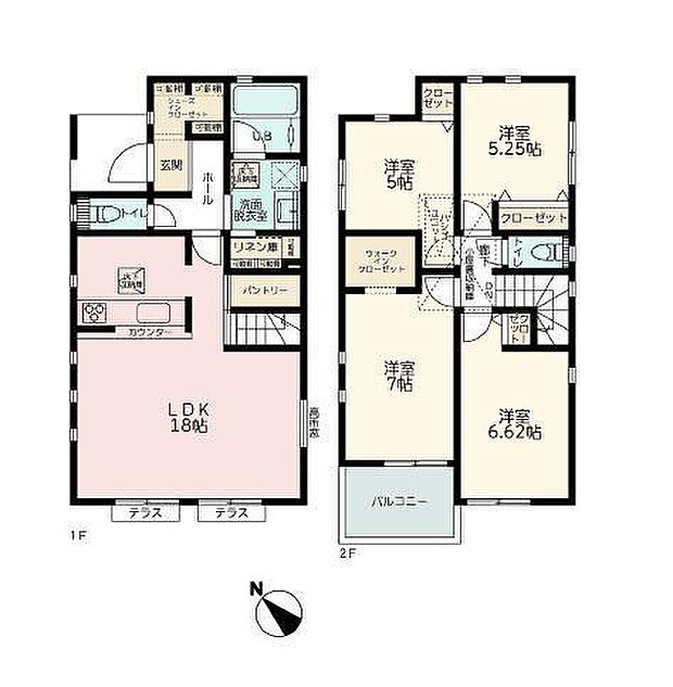 | 間取り | 4LDK 間取り内訳:リビングダイニングキッチン 18帖(1階)・洋室 5帖(2階)・洋室 5.2帖(2階)・洋室 7帖(2階)・洋室 6.6帖(2階) |