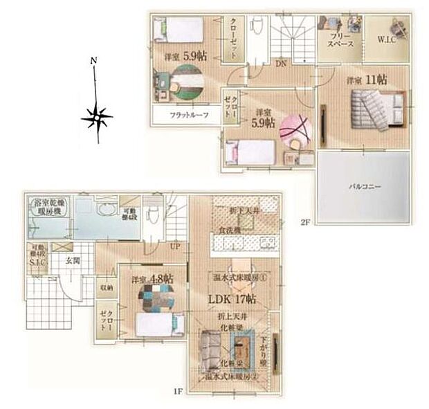 | 間取り | 4LDK 間取り内訳:リビングダイニングキッチン 17帖(1階)・洋室 4.8帖(1階)・洋室 5.9帖(2階)・洋室 5.9帖(2階)・洋室 11帖(2階) |