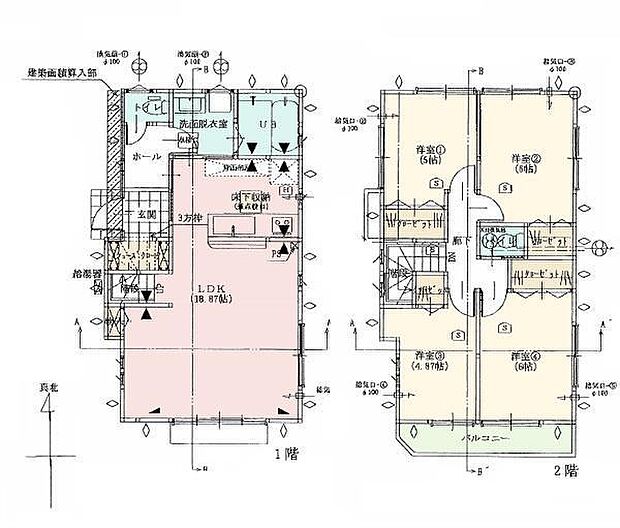 | 間取り | 4LDK 間取り内訳:洋室 5帖(2階)・リビングダイニングキッチン 18.8帖(1階)・洋室 4.8帖(2階)・洋室 6帖(2階)・洋室 6帖(2階) |