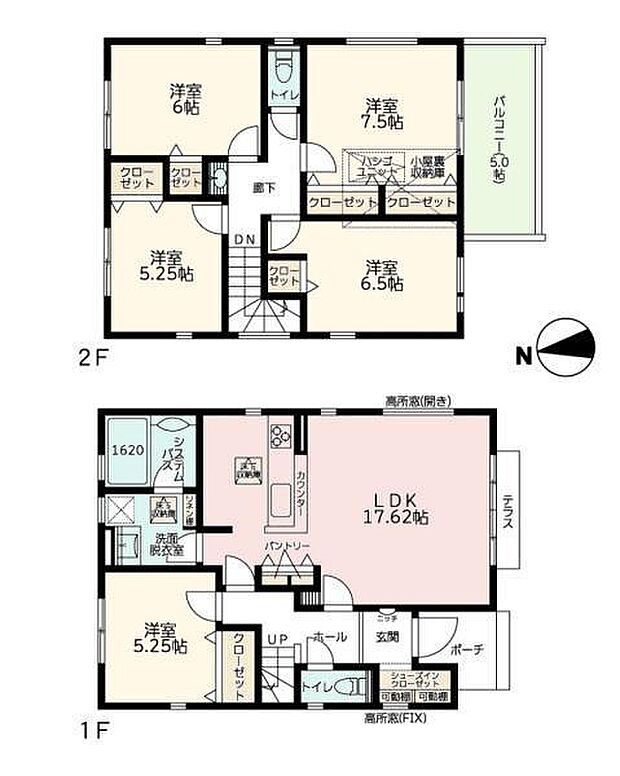 間取り内訳:リビングダイニングキッチン 17.6帖(1階)・洋室 5.2帖(1階)・洋室 6帖(2階)・洋室 5.2帖(2階)・洋室 6.5帖(2階)・洋室 7.5帖(2階)