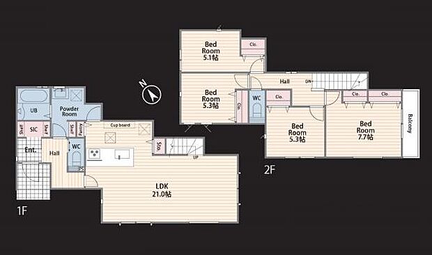 | 間取り | 4LDK 間取り内訳:リビングダイニングキッチン 21帖(1階)・洋室 5.1帖(2階)・洋室 5.3帖(2階)・洋室 5.3帖(2階)・洋室 7.7帖(2階) |