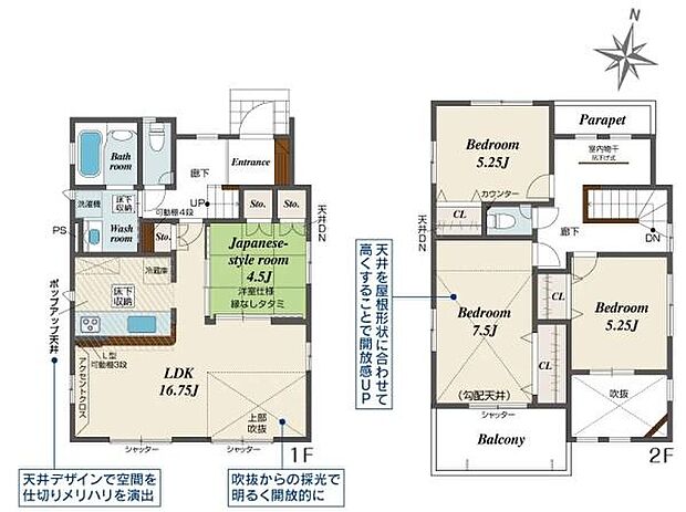| 間取り | 4LDK 間取り内訳:リビングダイニングキッチン 16.7帖(1階)・和室 4.5畳(1階)・洋室 5.2帖(2階)・洋室 7.5帖(2階)・洋室 5.2帖(2階) |