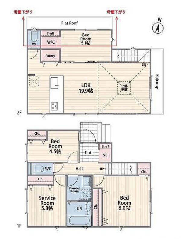 間取り内訳:洋室 4.5帖(1階)・収納 5.3帖(1階)・洋室 8帖(1階)・洋室 5.1帖(2階)・リビングダイニングキッチン 19.9帖(2階)