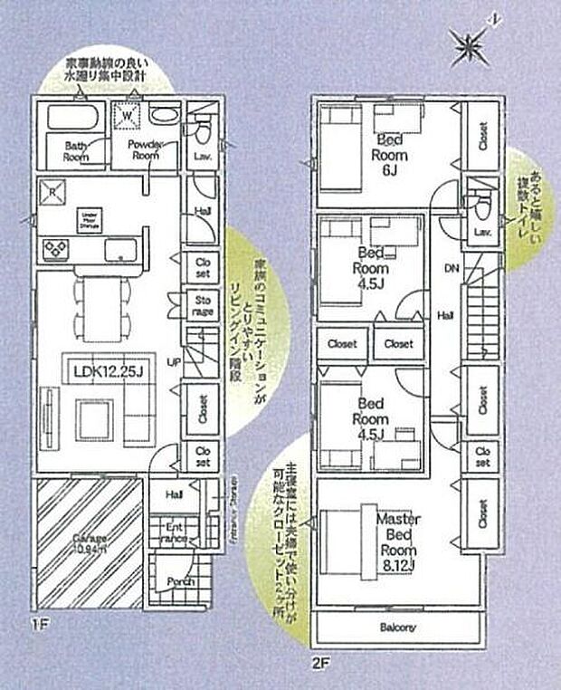 | 間取り | 4LDK 間取り内訳:リビングダイニングキッチン 12.2帖(1階)・洋室 6帖(2階)・洋室 4.5帖(2階)・洋室 4.5帖(2階)・洋室 8.1帖(2階) |