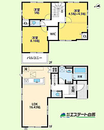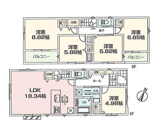 | 間取り | 5LDK 間取り内訳:リビングダイニングキッチン 18.3帖(1階)・洋室 4.9帖(1階)・洋室 8.8帖(2階)・洋室 5.8帖(2階)・洋室 5.8帖(2階)・洋室 6.6帖(2階) |