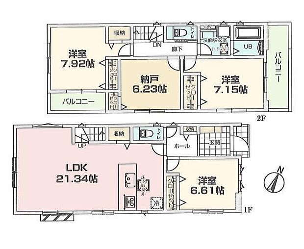 | 間取り | 3SLDK 間取り内訳:リビングダイニングキッチン 21.3帖(1階)・洋室 6.6帖(1階)・洋室 7.9帖(2階)・収納 6.2帖(2階)・洋室 7.1帖(2階) |