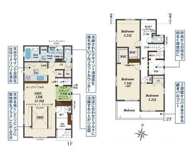 | 間取り | 3LDK 間取り内訳:リビングダイニングキッチン 21.5帖(1階)・洋室 5.2帖(2階)・洋室 7.3帖(2階)・洋室 5.2帖(2階) |