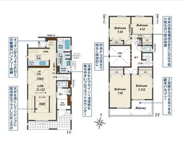 | 間取り | 3LDK 間取り内訳:洋室 9.5帖(2階)・リビングダイニングキッチン 21.1帖(1階)・洋室 7帖(2階)・洋室 5.2帖(2階) |